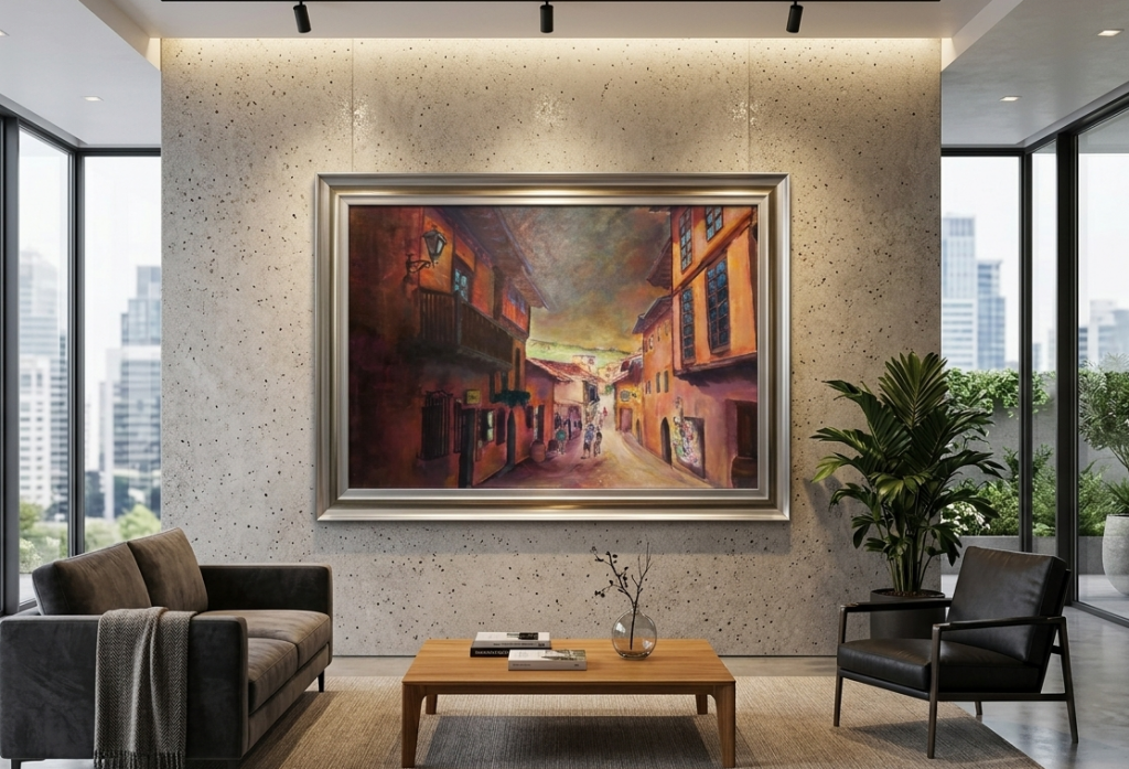 Esta pintura, mostrada en un elegante marco dorado y plateado, presenta una escena de calle adoquinada en una ciudad colonial europea o latinoamericana. Los edificios son altos y están pintados en tonos cálidos de rojo, naranja y amarillo, con ventanas de color azul vibrante y balcones de madera en los niveles superiores. En primer plano, las siluetas de algunas personas caminan por la calle, que está flanqueada por las estructuras más oscuras. Al fondo, la calle asciende por una colina y se ven edificios blancos y una cúpula bajo un cielo cubierto. El cuadro está iluminado por una luz suave que realza los colores cálidos de los edificios y los detalles de las ventanas azules. La escena está enmarcada por un marco dorado y plateado muy trabajado.