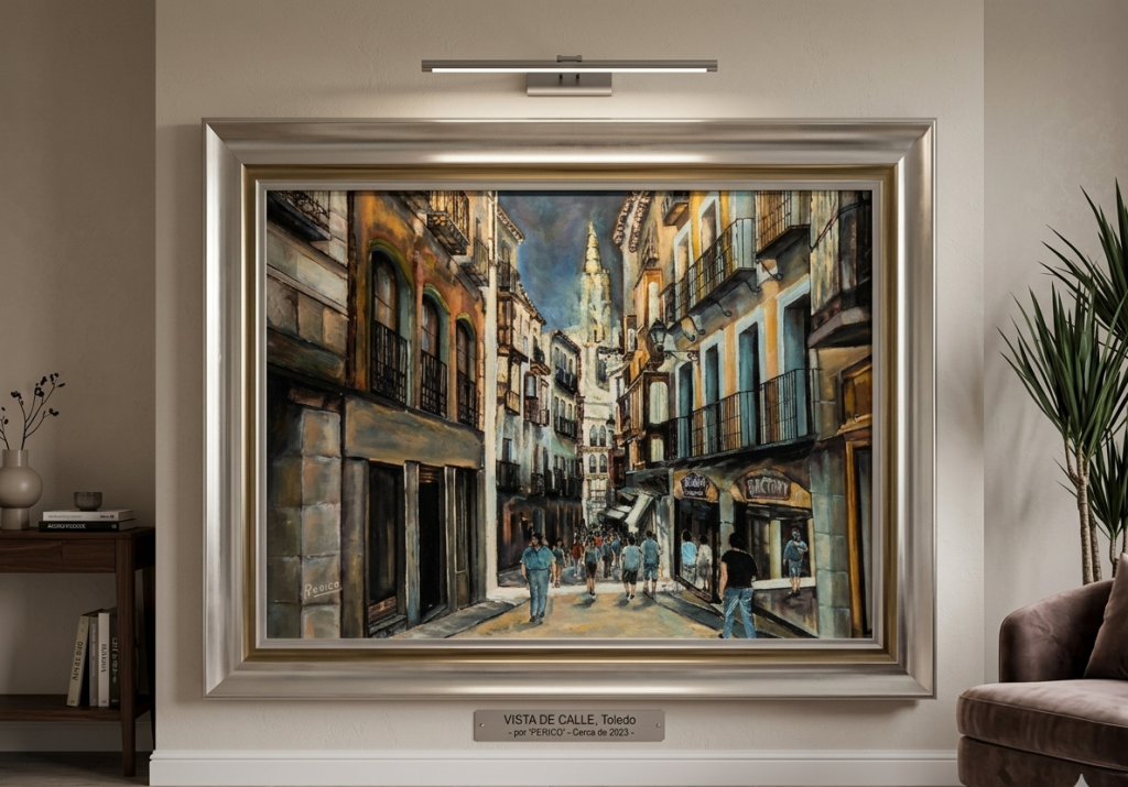 Esta obra es una escena urbana vibrante que captura la esencia de una calle histórica, probablemente inspirada en la arquitectura española (el archivo se titula «Valencia», aunque el estilo recuerda a ciudades monumentales como Toledo). El cuadro utiliza una perspectiva de un solo punto de fuga muy marcada. Las líneas de los edificios a ambos lados convergen hacia el centro de la imagen, guiando nuestra mirada directamente hacia una torre iluminada (posiblemente un campanario o catedral) que se alza al fondo bajo un cielo nocturno o de crepúsculo. Se observa una técnica de pincelada suelta y empastada, lo que le da una textura casi impresionista. No busca el hiperrealismo, sino capturar la atmósfera y la luz. Contraste: Existe un juego dramático entre las zonas en sombra de la calle y los puntos de luz cálida que emanan de los escaparates y la iluminación monumental del fondo.