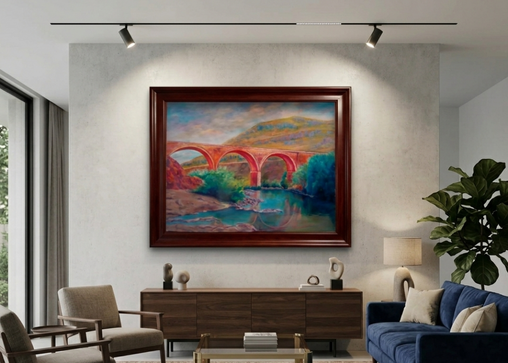 Este cuadro es un paisaje pintado con un estilo un poco impresionista, con pinceladas sueltas y colores suaves. En él vemos un gran puente de piedra con tres arcos que cruza un río. El puente es de color rojizo y se refleja en el agua azul y turquesa del río, que tiene piedras y vegetación en las orillas. Al fondo, detrás del puente, hay una montaña grande y verde con algunos tonos amarillos y morados. El cielo está nublado, con nubes blancas y grises sobre un fondo azul claro. La escena transmite tranquilidad y naturaleza.