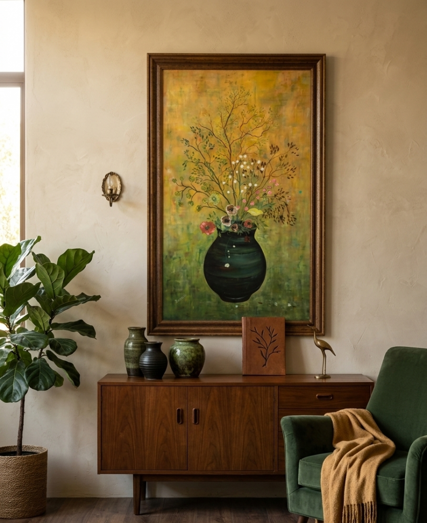 El ramo también incluye varias ramas con hojas de diferentes formas y colores, como verde oscuro, verde claro y marrón. El fondo es una mezcla de verde y amarillo, con algunas pinceladas más oscuras y más claras que crean una textura interesante. La pintura está enmarcada en un marco de madera oscura.